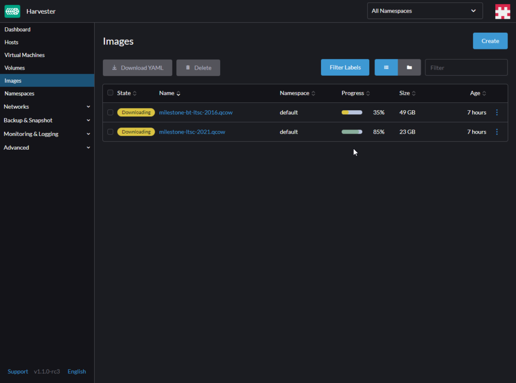 So I turned off the host and dug the NVMe with my images out, and popped it in a USB enclosure, thinking I’d use the upload option from my laptop. I watched the progress bar for long enough to know when to walk away – the file was 23GB, so I knew it should take a while – but the whole thing left me feeling uneasy that the process wouldn’t work. Sure enough, when I returned to the upload page, there was a “context cancelled” error. I tried it two more times, but Harvester kept thinking I had cancelled the upload at 99% finished. I am fairly certain I encountered a bug, but no time to file an issue, I’ve gotta see if this thing will even function for our workloads, and this wasn’t instilling me with the utmost confidence.
