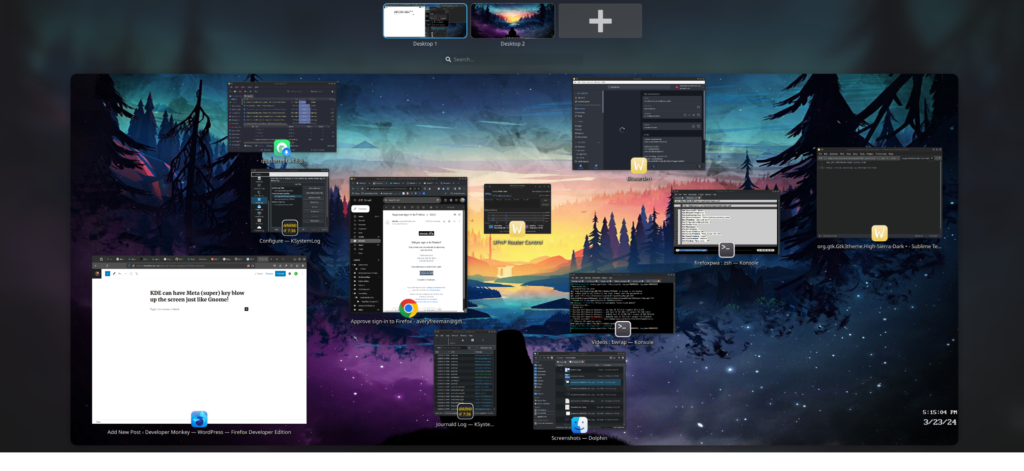 key behavior in KDE is getting KDE to interpret a single keypress as a keyboard shortcut. If you look at it critically, you can see there’s a lot going on in that single keypress in Gnome: In Gnome, a single keypress gives you both the open windows overview, and a search bar, and even has additional menus accessible from repeating the action (double-pressing super