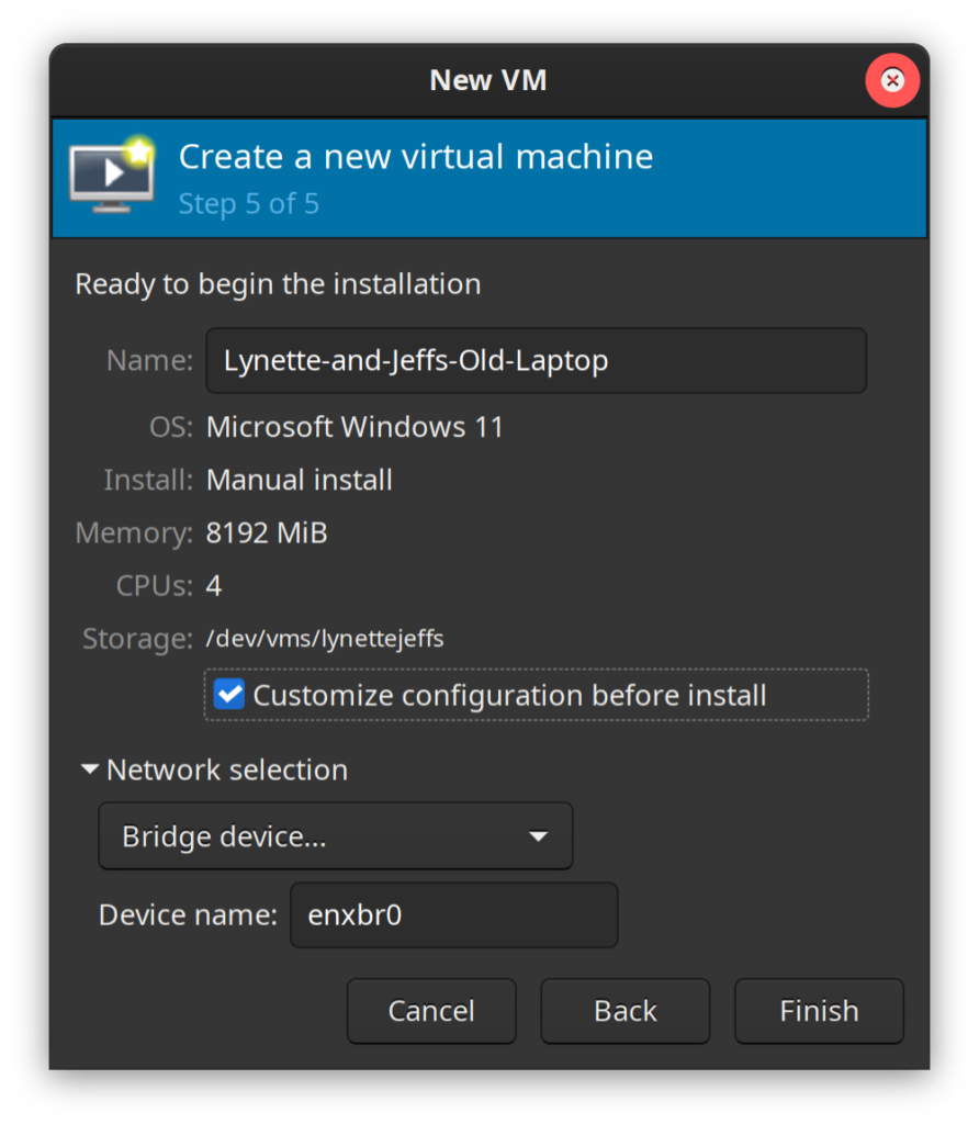 Give your VM a memorable name, choose its network (shown here using physical NIC enslaved by Linux bridge, but default virbr0