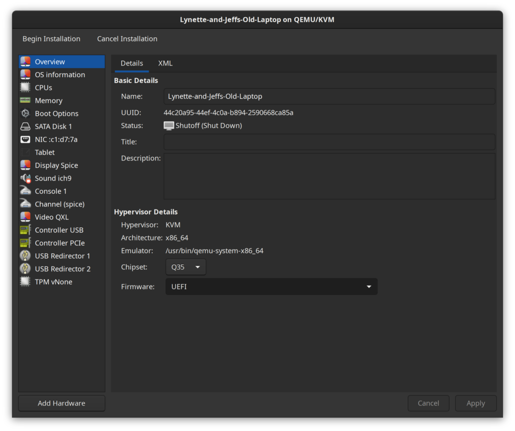 Note: While you could probably figure out how to adapt this to ‘bare’ QEMU, QuickEMU, or Gnome Boxes, I recommend the libvirtd