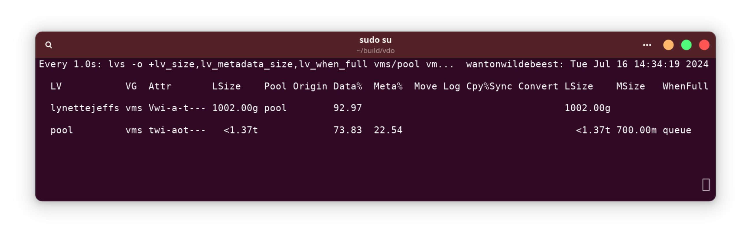 root@wantonwildebeest:/home/avery/vms# watch -n 1 'lvs -o +lv_size,lv_metadata_size,lv_when_full vms/pool vms/lynettejeffs'