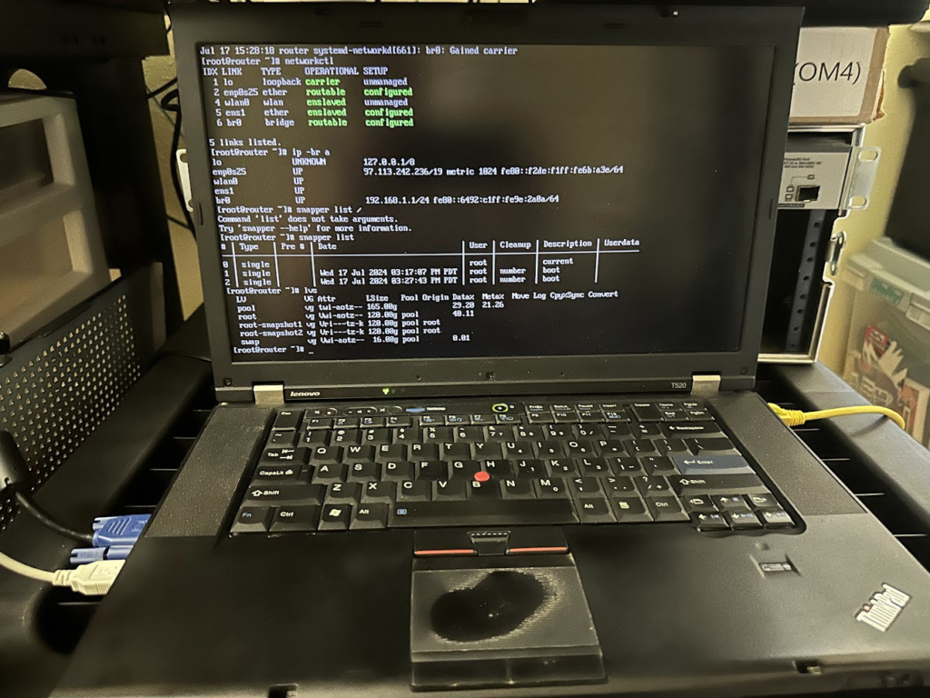 This one’s touchpad has died twice now, even after I replaced it the first time with a brand-new top cover. So, I was trying to figure out what to do with it, since I am attached for obvious reasons, but it’s a little heavy to lug around and a little shitty to use without a touchpad (is that unreasonable?). I used it as a domain controller for several years running server core 2019, but I ditched the domain when I moved, and needed a gateway more, so … history has been written.